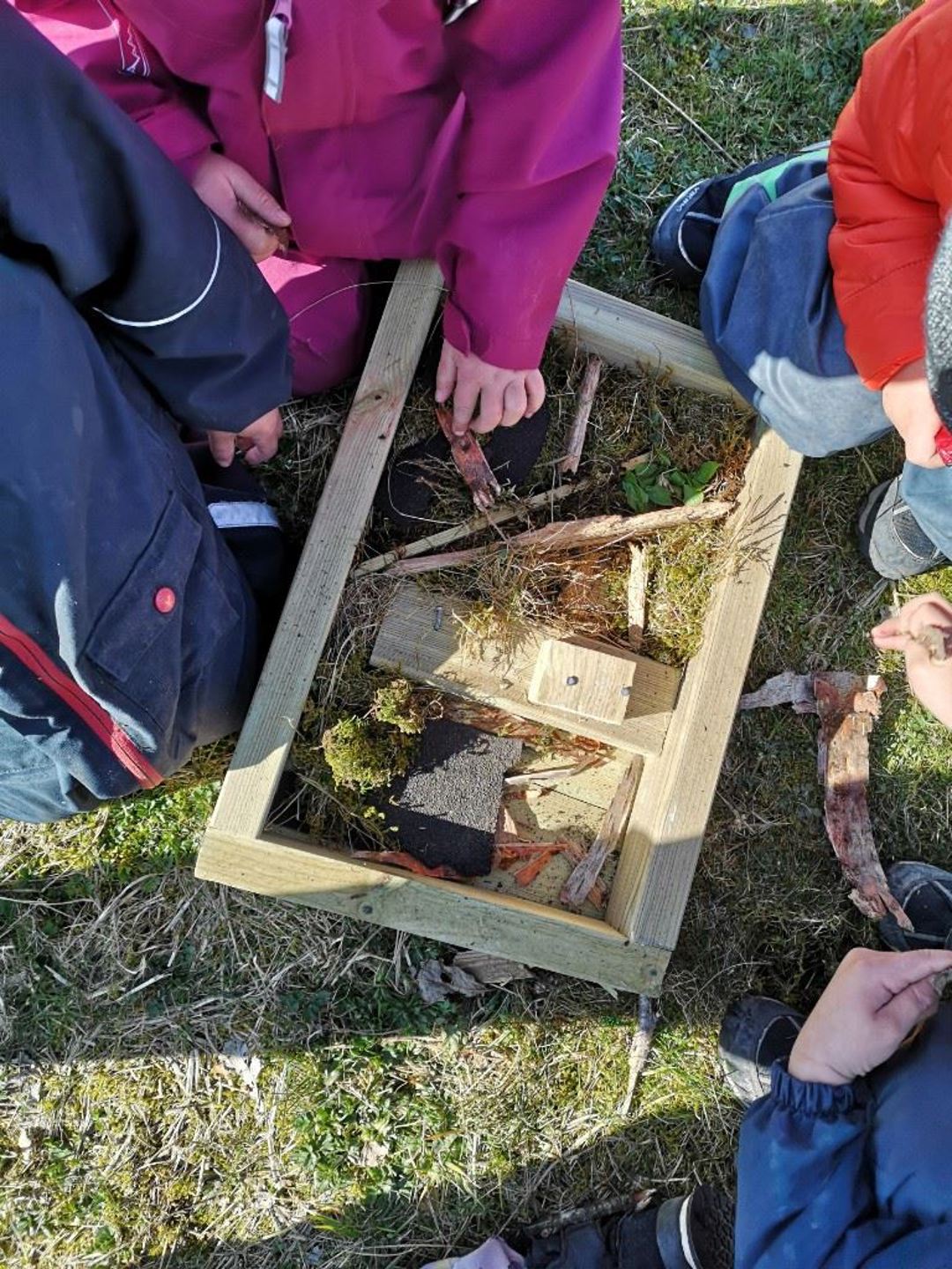 Vi i Kornberget er veldig opptatt av insekter og småkryp. Derfor passer det fint å kunne lage noe som de kan bo i. Barna er med på prosessen og får være med på å komme med idéer til utforming og plassering. Kjekt for både store og små.